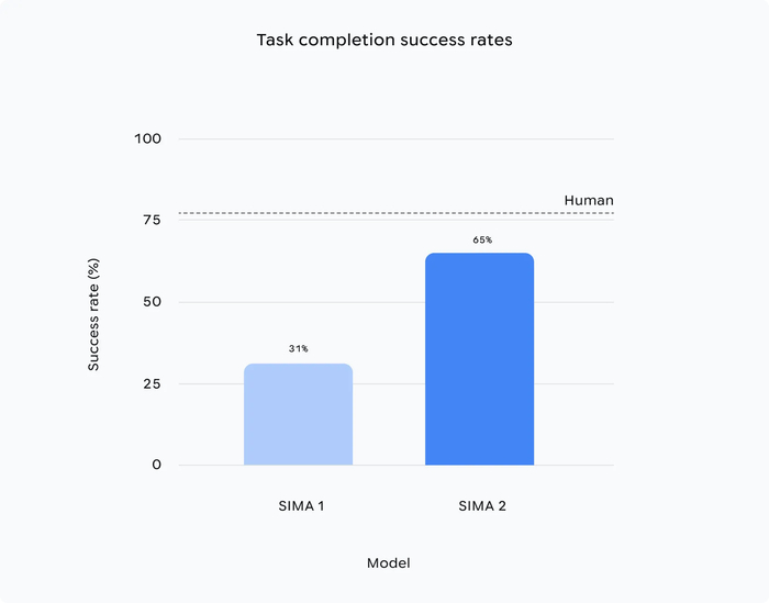 Самообучение также работает и для разных действий: методом проб и ошибок SIMA 2 с каждым разом всё лучше выполняет те или иные действия, в том числе и те, которым агента вовсе не обучали и в тех играх, которые до сих пор не задействовались.