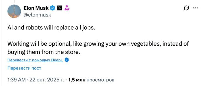 «ИИ и роботы займут все рабочие места. Работать можно будет по желанию. Это как, например, выращивать собственные овощи вместо того, чтобы покупать их в магазине», – написал Маск.