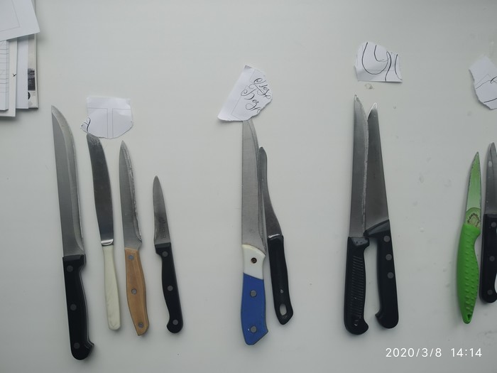 Ножи самые разные. Объединяет их одно- ни у одного не было живой кромки. Всего 16 ножей. 3 часа жизни.