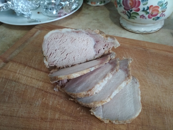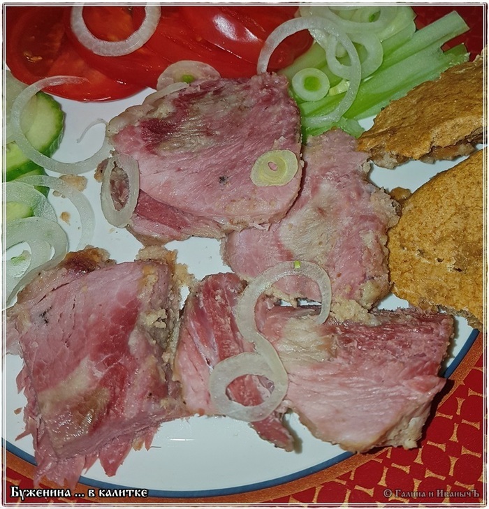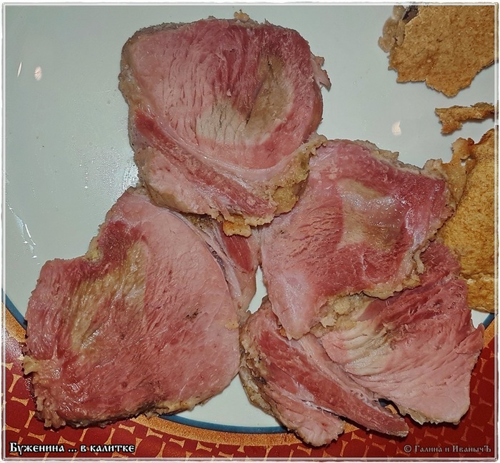 Вот такая получилась буженина. Мы сами, чесслово, не ожидали такого. А уж сочность просто запредельная. Прям бифштекс с кровью, но мясо полностью прожарено. Или пропарено? … В общем, абсолютно готово, без намека на те сырокровавосочные изыски, что есть у этого самого куска жареного мясо, который с кровью.