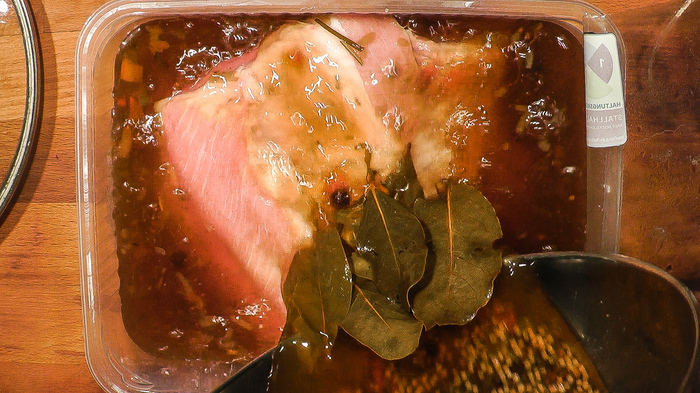 Мясо сначала хорошо промассировать, потом уложить в лоток. На дно лотка положить несколько горошин перца, лаврушки, чеснок нарезать. Все – по вкусу. Лоток закрыть плотно и отравить в холодильник. На ночь, как минимум, сутки – максимум. Через каждые четыре часа переворачивать надо.