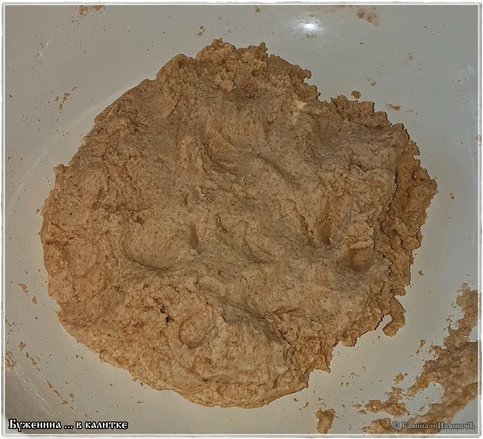 Пока мясо будет проветриваться, надо сколотить ту самую калитку. Ржаную. Три компонента. Ржаная мука, соль, вода. Смешать в пропорциях, чтобы не пересолить, конечно, и получить вот такое тесто. Мягкое, но не текучее. Объем теста ... примерно около двух стаканов.
