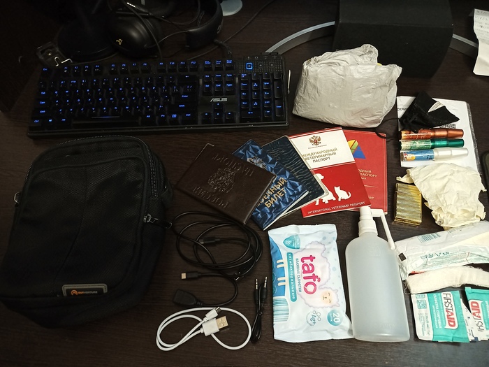 Ничего особенного, "аптечка" (Пшикалка это изопропиловый спирт), документы (+2 паспорта собак), пакет, зажигалка (не курю)