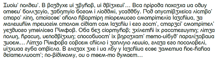 Знойный полдень. В воздухе ни звуков, ни движений… Вся природа похожа на одну очень большую, забытую богом и людьми, усадьбу. Под опустившейся листвой старой липы, стоящей около квартиры тюремного смотрителя Яшкина, за маленьким треногим столом сидят сам Яшкин и его гость, штатный смотритель уездного училища Пимфов. Оба без сюртуков; жилетки их расстегнуты; лица потны, красны, неподвижны; способность их выражать что-нибудь парализована зноем… Лицо Пимфова совсем скисло и заплыло ленью, глаза его посоловели, нижняя губа отвисла. В глазах же и на лбу у Яшкина еще заметна кое-какая деятельность; по-видимому, он о чем-то думает…