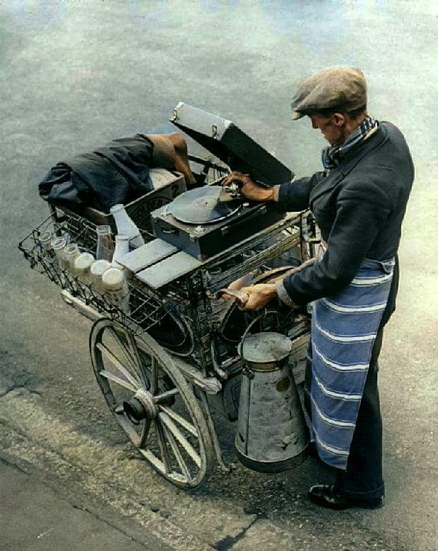 Его тележка — настоящая музыкальная шкатулка: патефон играет популярные мелодии, а старинный колокол своим звоном оповещает всю округу о прибытии молочника. Не просто доставка, а маленький праздник среди серых лондонских улиц.