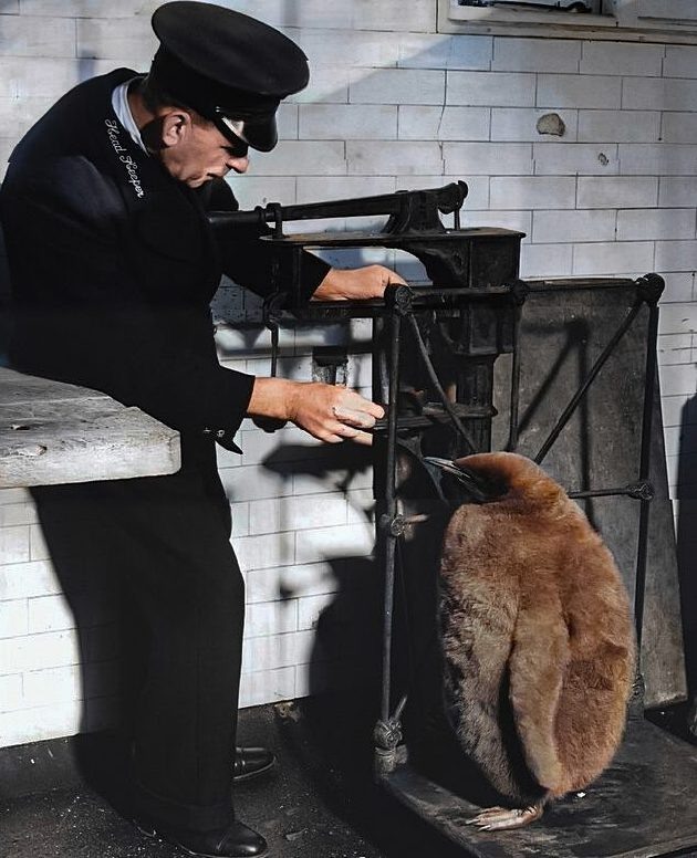 Взвешивание пингвинёнка. Смотритель Герберт Джонс на службе в Лондонском зоопарке, 1952 год
