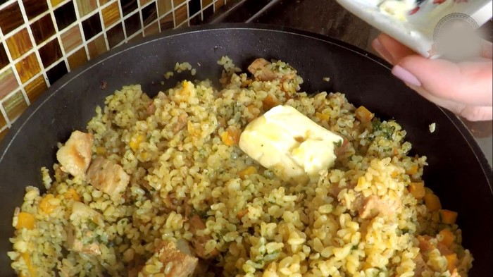 Сковороду нужно разогреть на сильном огне с маслом — как правило, используется 10–15 граммов сливочного или топленого масла на 100 граммов крупы. Оливковое или подсолнечное может перебить аромат. На горячую сковороду высыпается крупа и тщательно помешивается деревянной лопаткой. Как только появился золотистый цвет или начал раздаваться запах орехов, снимаем с огня и перекладываем в кастрюлю для варки.