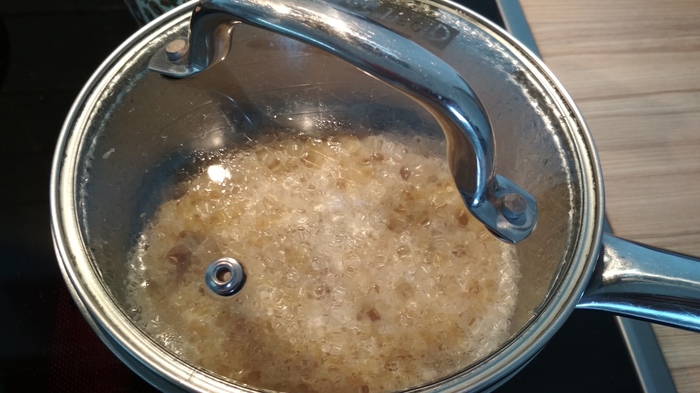 Кастрюлю помещаем на уже разогретую конфорку. Сколько варить по времени зависит от того, сколько залито воды — 15 или 20 минут под закрытой крышкой на слабом огне, не размешивая. Вся вода должна выпариться.