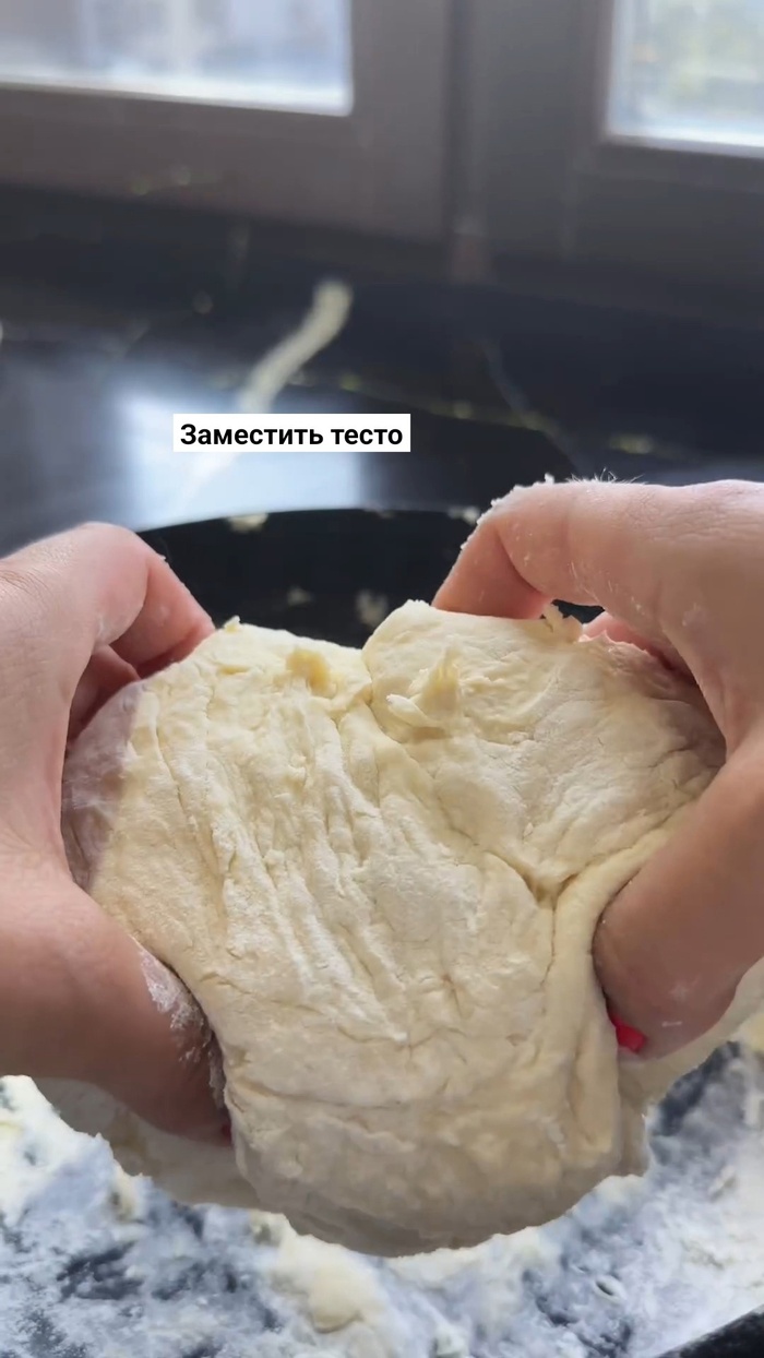 Через 1.5 часа тесто должно увеличиться в 2 или 3 раза. Достаем его из миски и выкладываем на стол. Так как тесто у нас сделано на молоке с маслом, оно получается эластичным и практически не липким. Можете не подпылять стол и не смазывать его маслом.