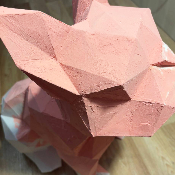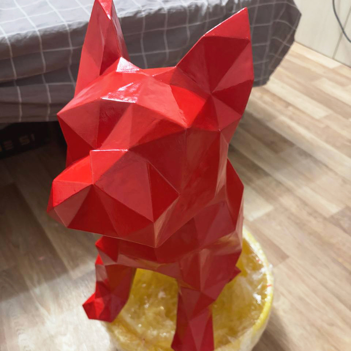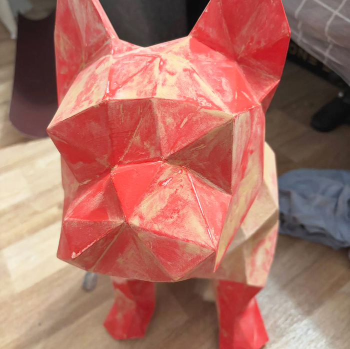 Поступил заказ на бульдога — обычная работа, думала, соберу как всегда. Но не учла один важный момент: у меня остался только кривой файл развертки. Плоттера не было, резала всё вручную. Уже на этом этапе стало понятно, что что-то идёт не так: полигоны упрямо не сходились, бумага намокала и рвалась.