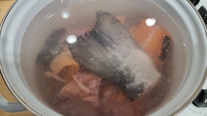 Для начала я разморозил рыбью бошку с плавниками и позвоночником.