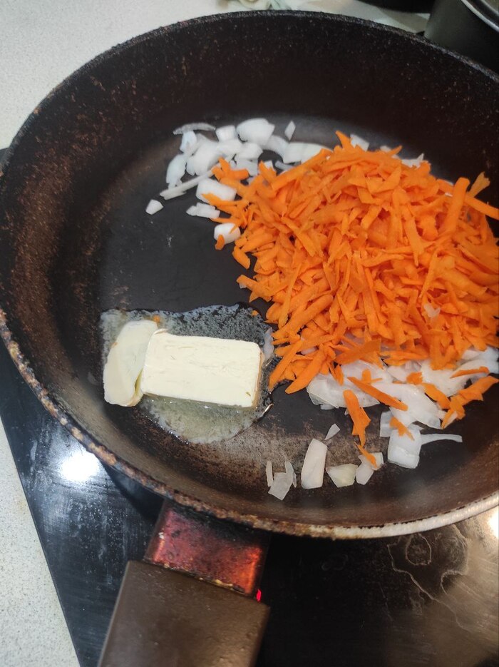 Можно обойтись луком и морковкой, просто я большая поклонница корнеплодов для бульонов. Нарезать всë добро крупными кусками и обжарить на смеси сливочного и растительного масел до румянца.