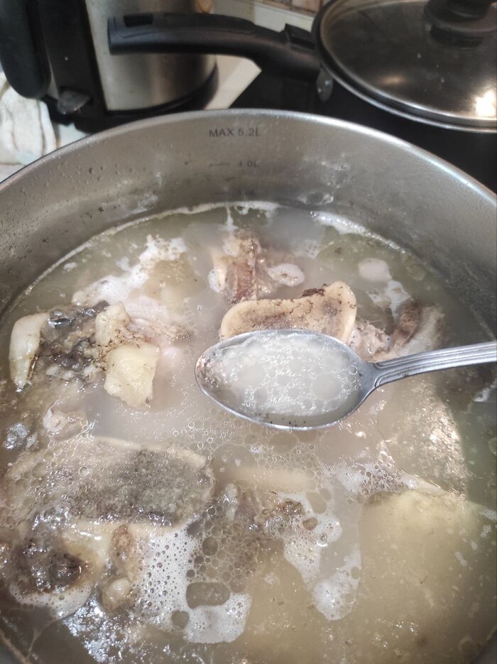 400 г хребта и плавников (плоть я не снимала ложкой, пусть варится) на бульон