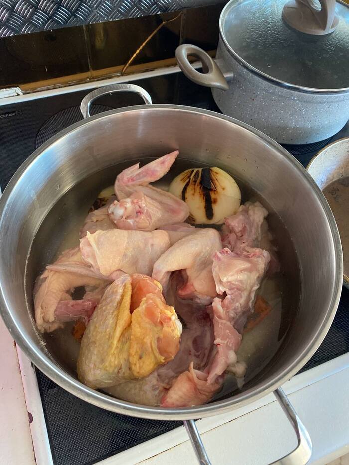Этот рецепт - для ооочень насыщенного бульона. Можно при том же соотношении воды/овощей сварить бульон из половины курицы, тоже будет норм. Можно вынуть какие-то сегменты, типа ноги-бедра или грудки, для другого блюда, и тоже будет норм. Это метод, а не канон.