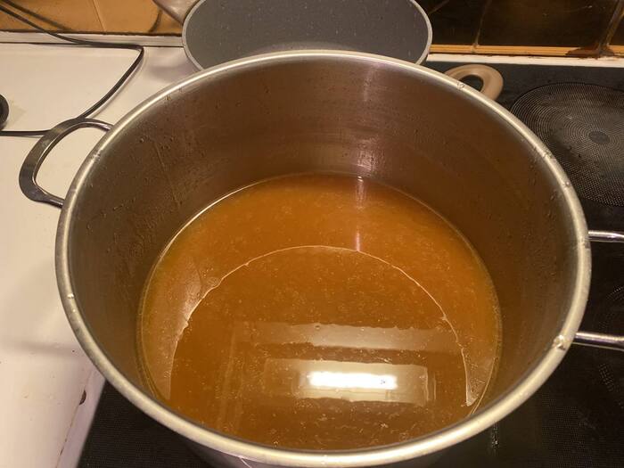 Ну что, задолбались? Все-все, следующие два часа можно просто иногда проходить мимо, слушать, как оно начинает благоухать. По первости еще появится немного пены, не обращайте внимания, скоро она уйдет слабым налетом на дно, а бульон станет золотым. И момент завершенности вы узнаете: часа через два жидкость плотная, костяшки курицы отделились от основного мяса, запах – феликс фелициус.