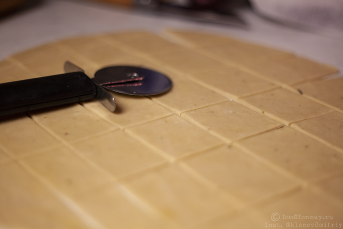 Пока вернёмся к лапше. Теперь её надо раскатать до толщины в +-2 миллиметра, а затем нарезать на +- одинаковые ромбики.