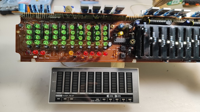 Индикатор эквалайзера, хотел сначала заколхозить в верхние сегменты красные и жёлтые светодиоды, потом плюнул и оставил как есть