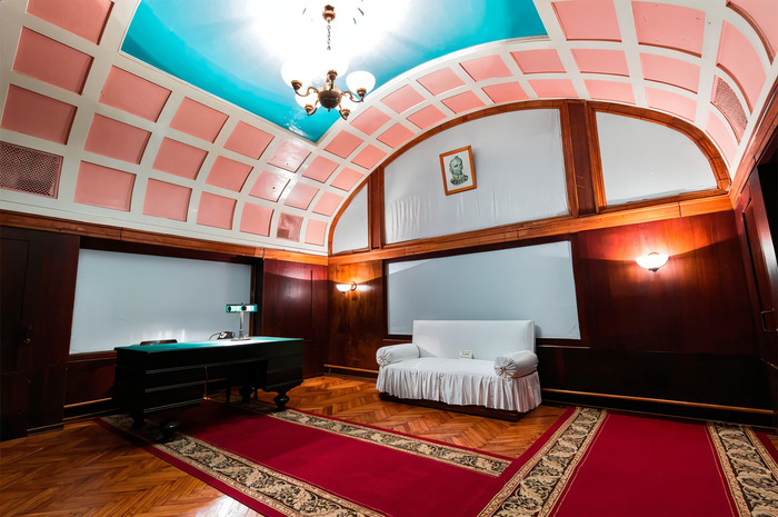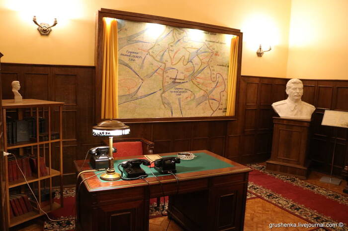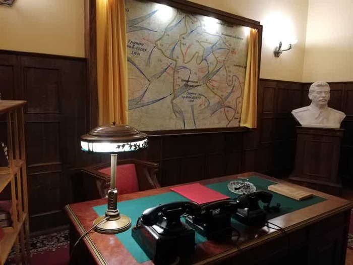 Комната отдыха Сталина. Это помещение представляет собой уменьшенную копию (32 квадратных метра) сталинского кабинета в Кремле, которого к настоящему времени не существует. В комнате всё подлинное: стол, кресло, телефон, лампа, диван и паркет. На стенах висят портреты любимых полководцев Сталина: Кутузова и Суворова. Шесть фальшивых дверей создают иллюзию большего пространства, так как наличие двери подразумевает наличие за ней ещё одного помещения. На самом деле реальных дверей всего две – входная и ведущая в туалет. Для создания ощущения простора также используются имитация окон и светлый потолок. Благодаря этим элементам даже на глубине 34 метров отсутствует ощущение тесноты.