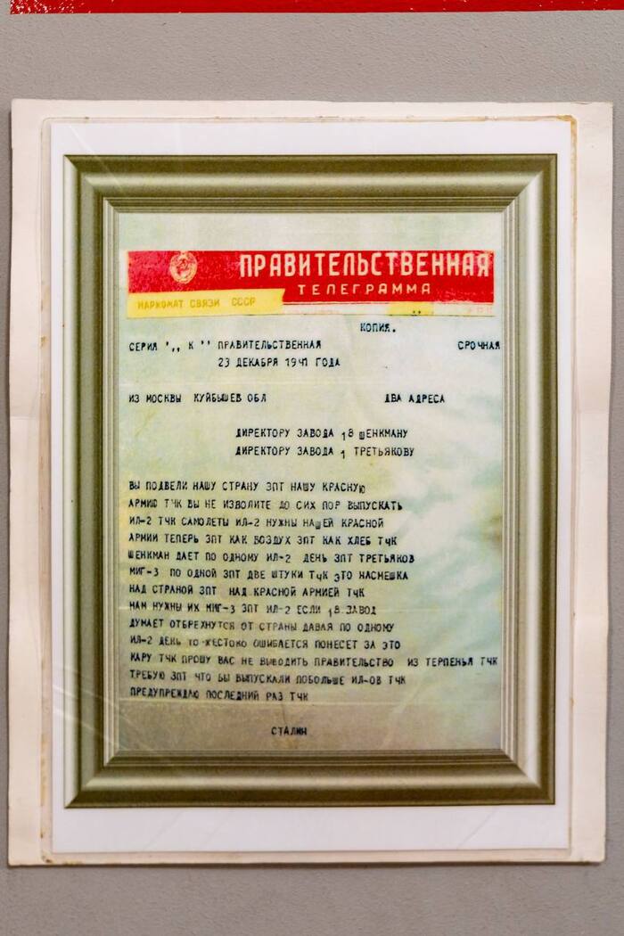 В Куйбышеве не было самого вождя, но в бункере есть предмет, который отражает как характер главы советского правительства, так и дух времени. Это телеграмма Сталина, отправленная 21 декабря 1941 года в Куйбышев. Она отличается эмоциональностью. Чтобы понять её посыл, нужно вспомнить, что с начала войны в Куйбышев переехало 84 промышленных предприятия. Среди первых заводов был Воронежский авиационный, который производил самолёты ИЛ-2. Всего два месяца прошло с момента прибытия первых эшелонов с оборудованием, а с аэродрома уже взлетает первый самолёт. После полного запуска предприятия начали выпускать по 1-2 самолёта в сутки. Именно тогда на завод пришла правительственная телеграмма, которая часто цитируется в сети, но иногда с пропусками или исправлениями.