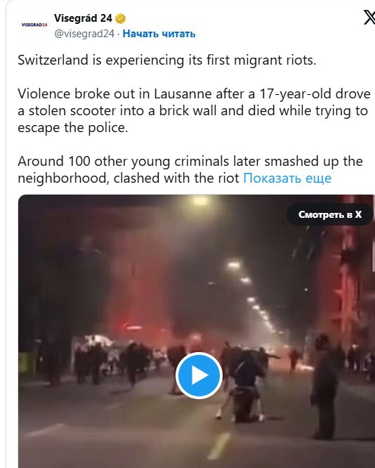 На этой неделе в одном из городов Швейцарии вспыхнули «мигрантские бунты». Видео со сценами насилия было опубликовано в социальных сетях. (X)