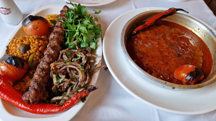 Слева на фото: Acili Zirh Kebabi (Kebab with Chili) ~920 рублей (230 лир)