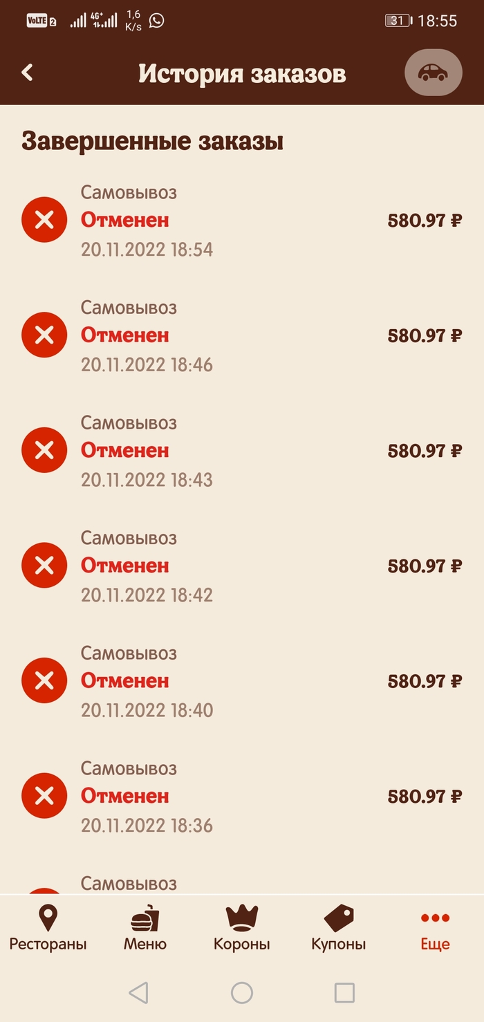 Решил заказать в бургеркинге за 99р. Гамбургер с мясной котлей ну еще плюсом что-то (не важно что). При попытке оформить заказ на стадии оплаты отказ. Поддрежка сообщила что проблемы на стороне банка. Ладно думаю бывает. Меняю карту оплаты на другой банк ситуация таже - отмена заказа. В этом случае поддержка не ответила ничего