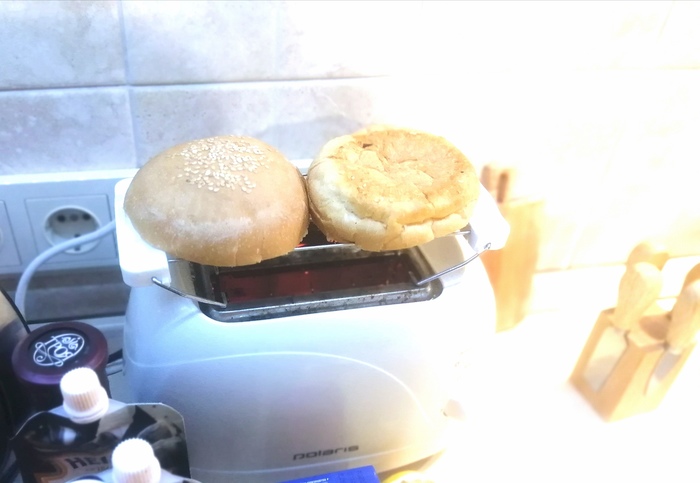 В таком виде и отправляю его в микроволновку на 30 секунд, чтобы сыр подтаял, булочки размягчились, и подогрелась котлета.