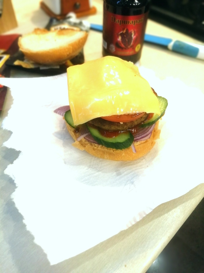Решил попробовать приготовить сэндвичи из них. Прикупил плавленый сыр, овощи и булки, все там же.
