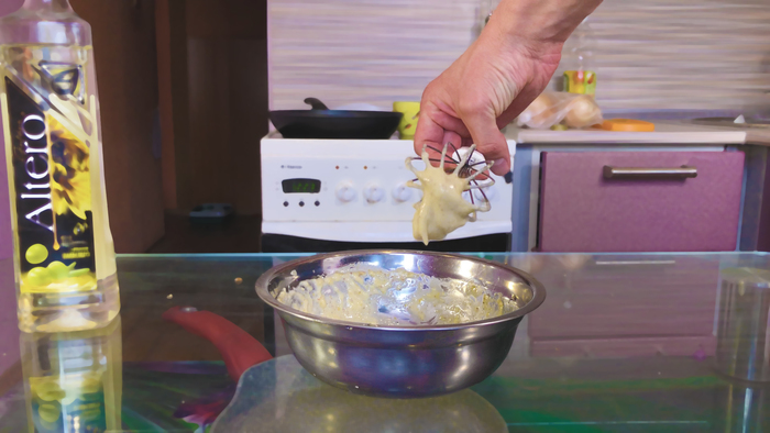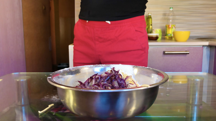 Шаг 5: Очень тонко нарезаем лук. Я ради этого купил специальную терку, но результат меня разочаровал. Пришлось вернуться к старому проверенному варианту. Это наши руки и нож. После того как нарезали лук, из него необходимо выжать большую часть воды.