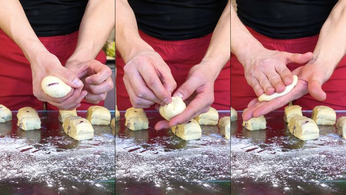 Шаг 2: Спустя два часа тесто отлично поднялось, поэтому выкладываем его на присыпанный мукой стол и делим на 10 частей. Дальше формируем булочки. Для этого берем кусок теста. Формируем из него шарик, который в свою очередь проталкиваем через кольцо составленное из двух пальцев руки. Полученный шарик прищипываем с конца, после чего расплющиваем его ладонями.