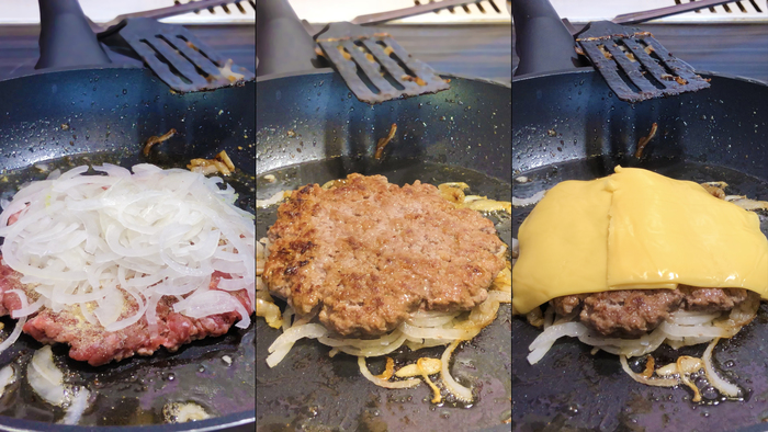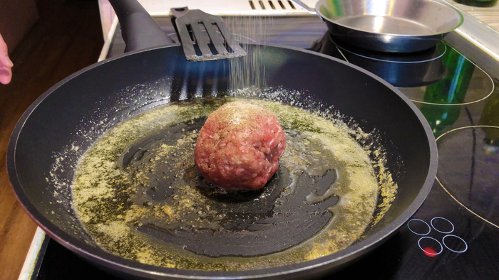 Шаг 7: Нагреваем сковороду с кусочком сливочного масла. И как только сковорода хорошо прогрелась, мы выкладываем шарик фарша. Приправим шарик солью, перцем и немного чесночного порошка. Дальше берем плоскую и широкую лопатки и расплющиваем шар фарша в котлету толщиной не больше сантиметра. Теперь на котлету выкладываем хорошее количество лука, жарим 3-4 минуты на высоком огне.