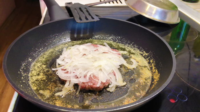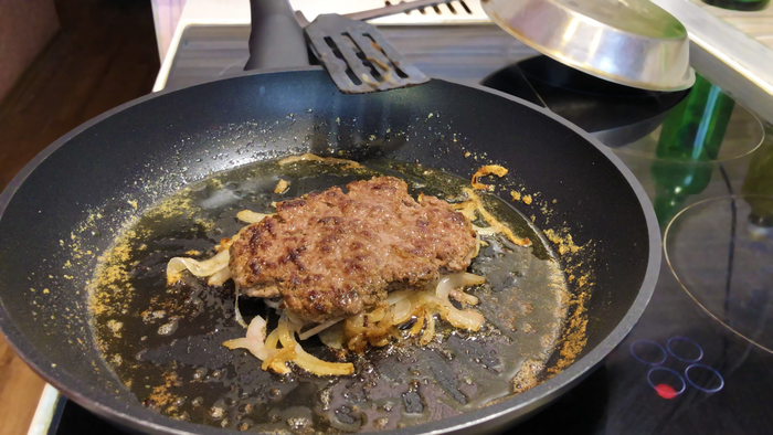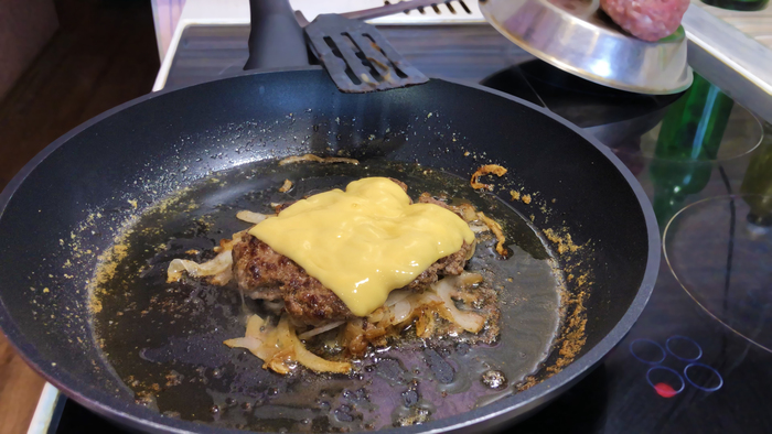 В это время лук жарится и карамелизируется. и запах при этом 15 из 10. За 1-2 минуты до конца накрываем котлету крышкой чтобы сыр поплавился и котлета хорошо пропиталась луковыми парами.
