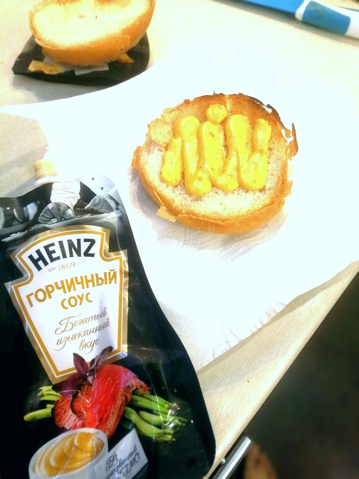 На нижнюю булочку добавляю горчичный соус, именно его а не обычную горчицу, он не перебивает весь вкус, а слегка дополняет.