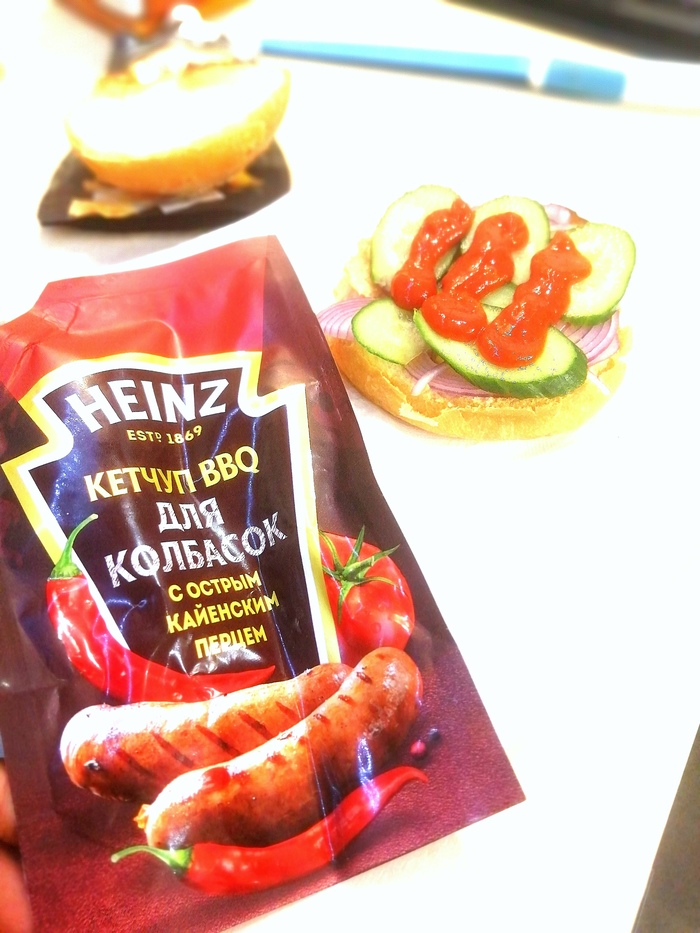 На горчичный соус выкладываю лук и огурец, и сверху поливаю любимым острым Хайнц с кайенским перцем