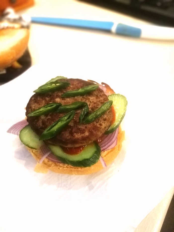 Далее ложится котлета а на неё чили перец, люблю поострее. Для тех кто не любит острое, Чили лучше не ложить, и заменить соус с перцем на обычный, а вот горчичный совсем не острый, понравится всем.