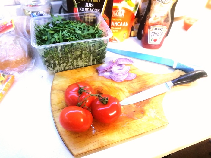 Пока они жарились, порезал овощи: помидор, огурец, красный лук, зелёный перец Чили, помыл руколу.