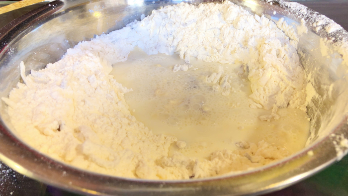 Теперь вливаем теплое молоко 150 мл. и теплую воду 100 мл. Начинаем замешивать тесто ложкой и как тесто свяжется, мы переходим к ручному замесу.