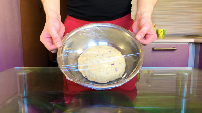 Дальше тесто убираем в глубокую миску смазанную маслом. Тесто можно слегка обтереть маслом. После чего накрываем тесто пленкой и составляем его в покое в тепле часа на 2 либо пока его размер не увеличится в двое.