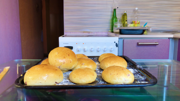 Смазанные булочки выпекаем в предварительно разогретой до 180-200 градусов духовке 15-20 минут. Готовность булочек проверяем по старинке, зубочисткой. У готовой булочки зубочистка сухая.