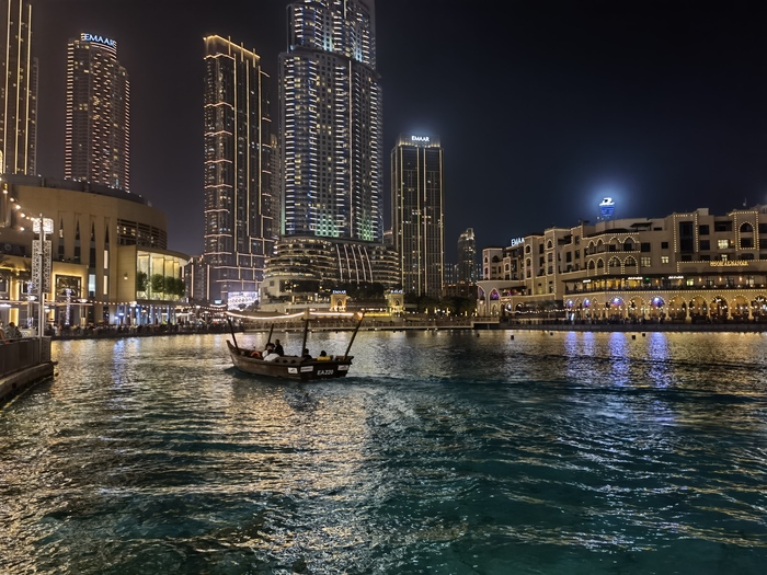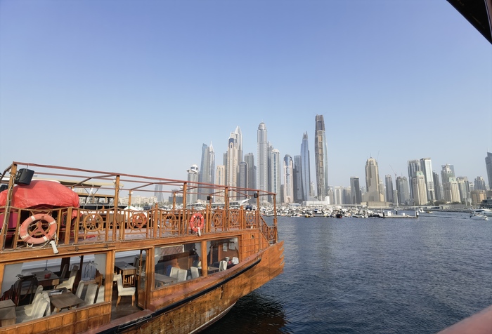 Ближе к вечеру у нас состоялась прогулка по каналу жилого района Дубай-Марина на арабской деревянной двухпалубной лодке доу с ужином и с выходом в открытое море, то есть в Персидский залив. Мы расположились на верхней палубе, на свежем воздухе. И когда мы вышли в море, он стал настолько свеж, что нам пришлось укутаться в мягкие пледы, любезно предложенные нам хозяевами лодки.