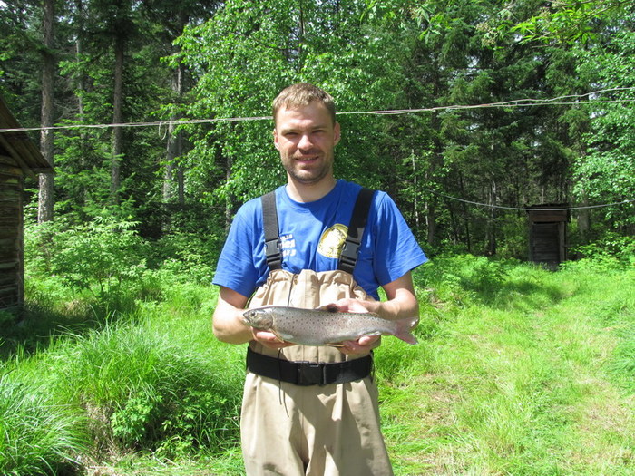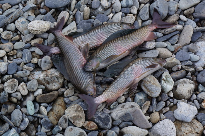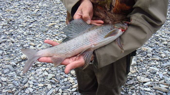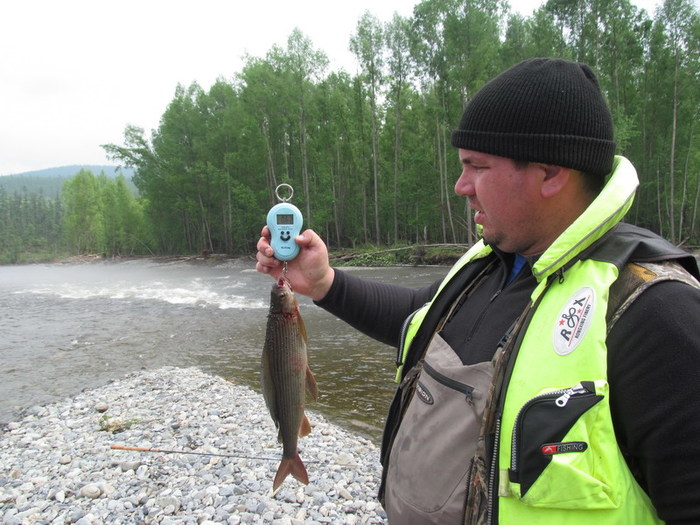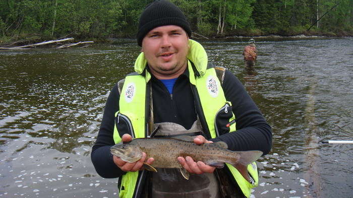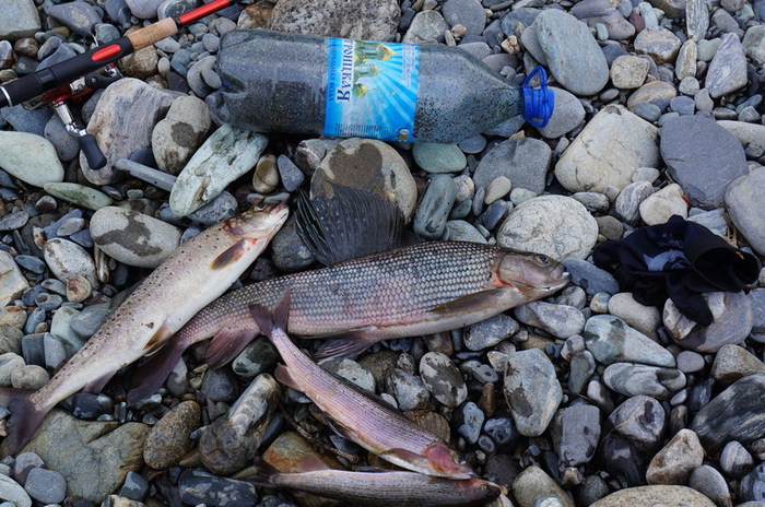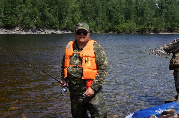 На одном из перекатов, Дима тянет небольшого хариуса, на берегу у кромки воды, тот срывается и пытается свалить в родную стихию. Парфён сначала пробует поддеть его ботинком, а потом падает на колени в воду и старается поймать его в воде руками. Со стороны это похоже на то, как медведи горных реках ловят рыбу, глуша её лапой! ( видел по телевизору). Наше недоумение сменяется гомерическим хохотом. Не поймав, таки, хариуса , Парфён встаёт и обиженно заявляет: « (Ху..) чо Вы ржёте, лучше бы помогли!» Мы конечно сплавщики ещё неопытные, и не знаем, что хариус вываживается всем коллективом! Серёга со своей желто-чёрной мормышкой опять ловил больше всех .