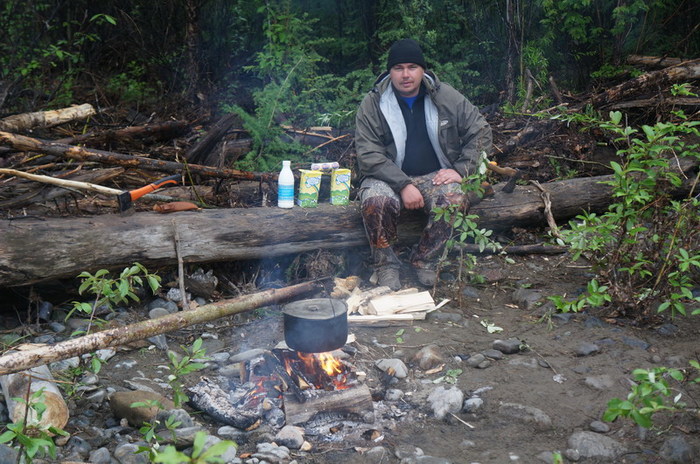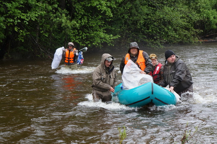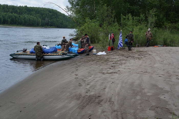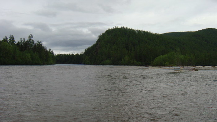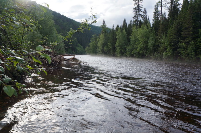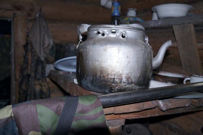 Бывалые охотники утверждали, что из этого чайника чаёк наливал сам михайло-потапыч. У меня на этот счёт есть сомнения, поэтому выставляю его на суд. Всю ночь лил дождь. Река на утро стала неузнаваема. Резко поднялась вода и стала неприятно рыжего цвета. Катамараны, оттащенные с вечера метром на 30 на берег, были практически в воде. Протока , отделявшая зимовьё от косы с палатками стала непроходима для болотных сапог. Приходиться , тем кто в вейдерсах, часть людей и вещи переправлять на Серёгиной лодке.