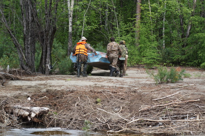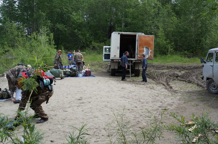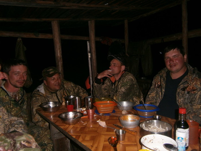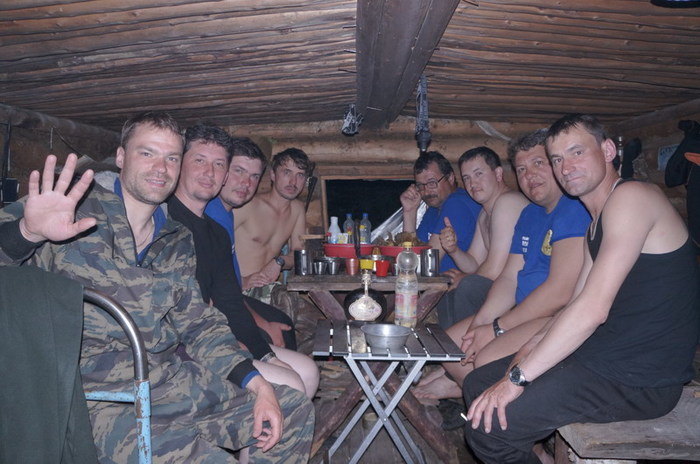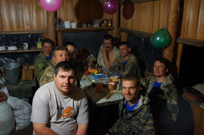 Попив чаёк с местными гидрологами, Серёга узнаёт страшную тайну: рыба не ловится даже на сети. И начинает подбивать народ форсировать сплав. Честно сказать, мы и сами не против. Для этого нам нужно пройти ещё 20 км до зимовья на левом Уссомахе. В прошлом году с него снималась команда Парфёна- за ними туда приезжала машина. У нас план другой: пройти на следующий день до эвенкийского посёлка Шахтинский по воде 60 км и там закончить водную часть сплава. Практически не рыбачим. Экономим время.
