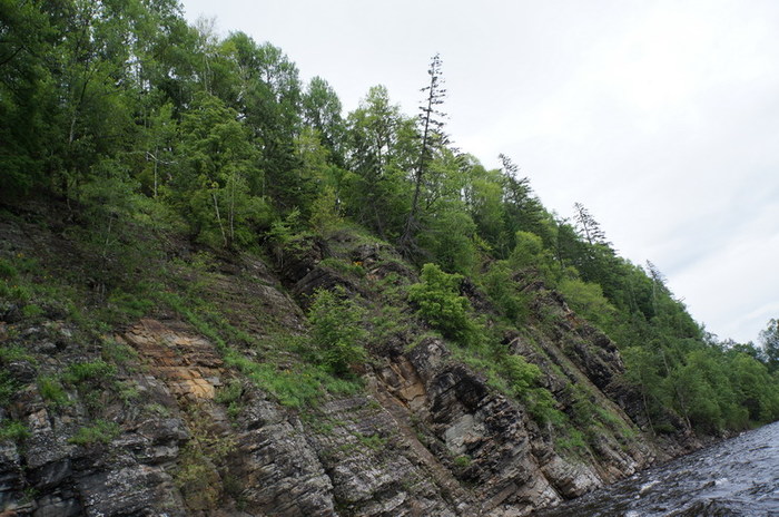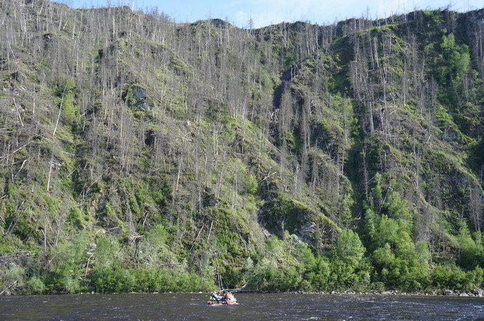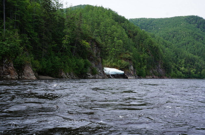 На одном из перекатов кат Парфёна ошибается в тумане и уходит не в тот слив. Мы следуем за ним. Разведка показывает невозможность дальнейшего прохождения по данной протоке. Что бы успеть проскочить по другой протоке до завала, протаскиваем каты насколько возможно против течения вверх. Стартуем по очереди. Правая сторона нашего ката чудом не впечатывается в завал. Потихоньку погода налаживается, а вместе с ней и рыбалка. Останавливаемся в красивейшем заливе под скалой. Сначала у Николая здоровый леняра, гонясь за блесной, промахивается и тыкается ему в сапоги, потом своего первого ленка ловит Игорь. «Начпроду» на ультралайт садится таймень кил на 8. Бегу за фотоаппаратом, но зря: таймень не стал щадить нервную систему Олега и спокойно ушёл в струю. Чуть ниже Парфён одновременно с Олегом Ларковым тянут по ленку. Диме везёт больше