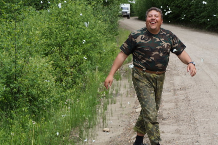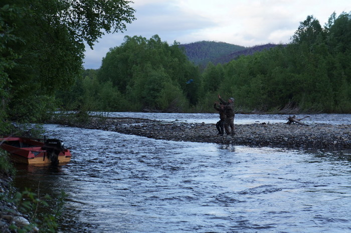 Возвратились на кордон, как оказалось, вовремя. Тут начинается самое интересное. Парфён с Николаем, поставив мотор на кат, переплыли на косу напротив с целью порыбачить. Ничего не поймав, пытаются вернуться назад, но мотор глохнет: кончился бензин. Парни зависают на косе. Начинается операция спасения челюскинцев . Варианта два: либо перекинуть бутылку с бензином через протоку, либо доставить им бензин на втором кате. Решаем доставить топливо по воздуху. Но существует опасность падения бутылки на камни, поэтому Парфён с Николаем группируются, становятся в интересную позу («Кин-дза дза», млин), и Женя кидает бутылку