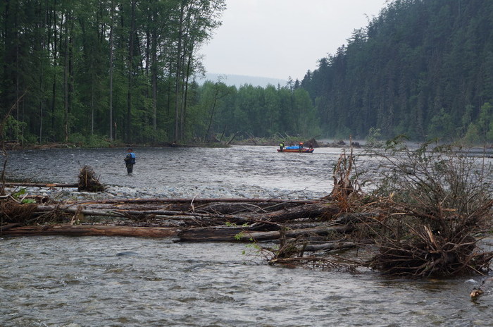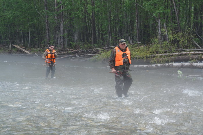 Идём ходом 30 км до стрелки слияния Правой и Левой Буреи. Там стоит кордон заповедника, там баня и гостевой домик. О рыбалке по такой воде не может быть и речи, но Ларков всё же замучивает одного ленка. По воде несёт деревья и всякие коряги. Временами река раздваевается и растраивается. Идём наобум, но нам в этом плане всё же везёт. Расчесали берёзкой лишь Игоря, в остальном проскакиваем опасные прижимы без последствий, хотя и на грани фола. Часов в 5 вечера выходим таки к месту слияния Правой и Левой Бурей. Реки сильно отличаются друг от друга. Если Левая разлилась на несколько проток и вода в ней рыжего цвета, то Правая течёт в одном русле чистейшей чёрной водой.
