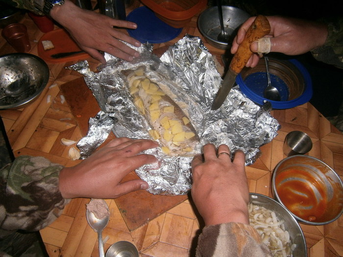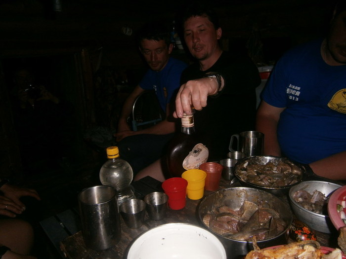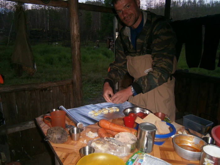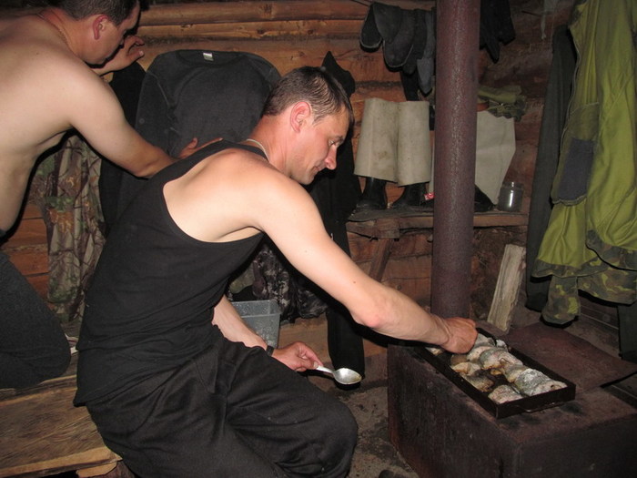 Но всё когда то кончается. Опять начался дождик, потом дождь, потом грозовой ливень. Передний кат и Серёга на лодке оторвались вперёд в поисках зимовья. Нас накрыл сплошной поток воды с неба. Молнии били в опасной близости, в какой то момент решили пристать , что бы переждать грозу, но поняв бесполезность поплыли дальше. Мысль, что где то впереди нас ждёт домик с крышей и печкой, гнала нас вниз по реке, несмотря на грозу. Домик мы нашли, и печка в нём была тоже. Но разместиться в нём на ночь реально могли 4 человека. Перебрав все варианты, ставим палатки на косе под проливным дождём. Набиваемся в зимовьё, сушимся, готовим ужин. Сегодня у нас на ужин три вида необдирчика, и два противня жареной рыбы.