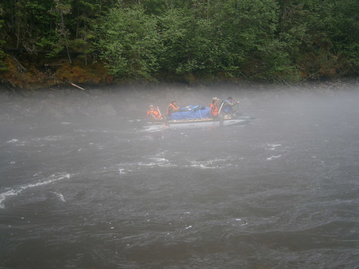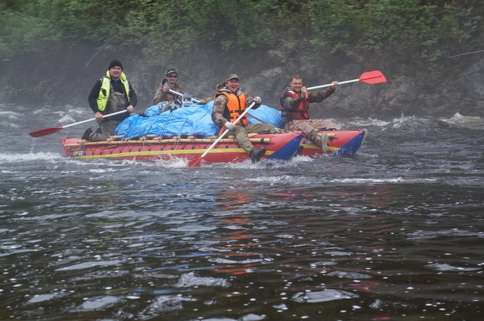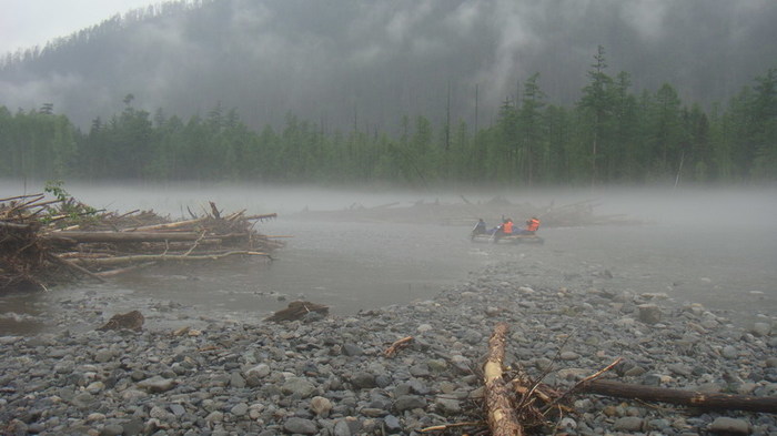 Встаём под весло. Опять начинается дождик и опускается туман. Первые пару часов не до рыбалки: выжить бы.