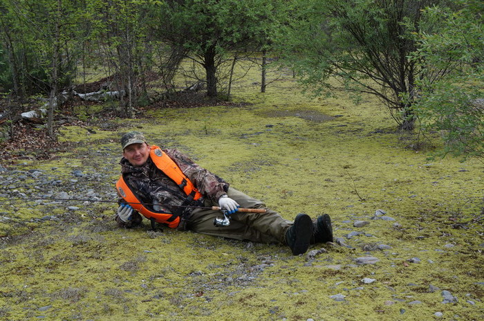 С огромным трудом перебравшись на противоположный берег пытаемся подняться по нему вверх в поисках уловистых мест. Но времени уже остаётся мало. Пустые возвращаемся назад . По дороге отдыхаем на природном ковре
