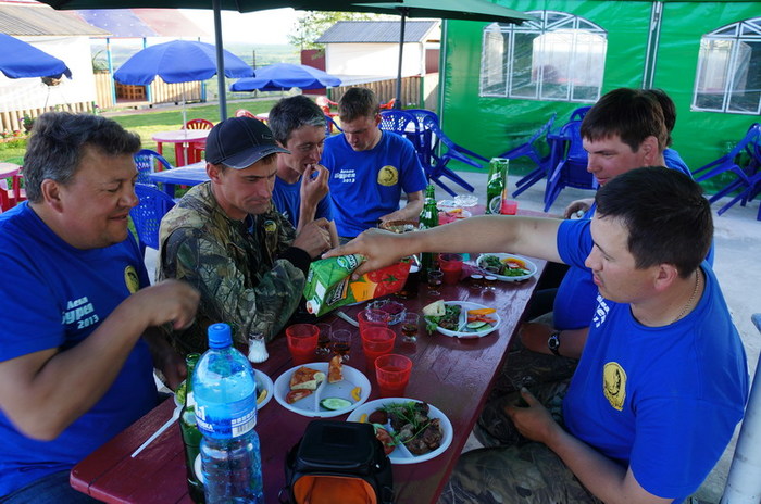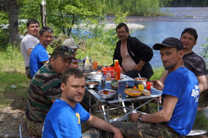 Народ уже потихоньку оголодал, поэтому вертится около кухни, донимая советами и предложениями чего-нибудь туда ещё бахнуть. Вообщем, коллективными усилиями, 12 литровое ведро борща было сварено и тут же съедено на берегу «большой» реки